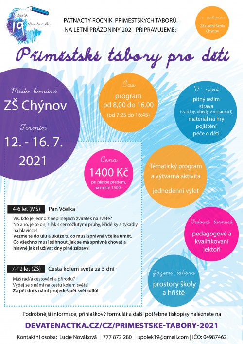 Zde přihlašujte Vaše děti na příměstské tábory 2021. V den nástupu na tábor odevzdáte vyplněnou přihlášku, která Vám přijde e-mailem spolu s potvrzením a dalšími informacemi.